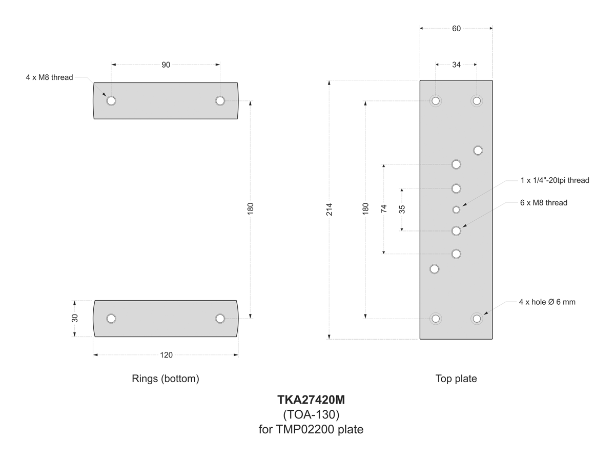 Tube rings allow optical tubes and accessories to be mounted parallel to the main instrument. They consist of a pair of rings and a top plate, the length of which varies according to the optical tube. Drillings and threads are made in the top plate for the attachment of accessories.