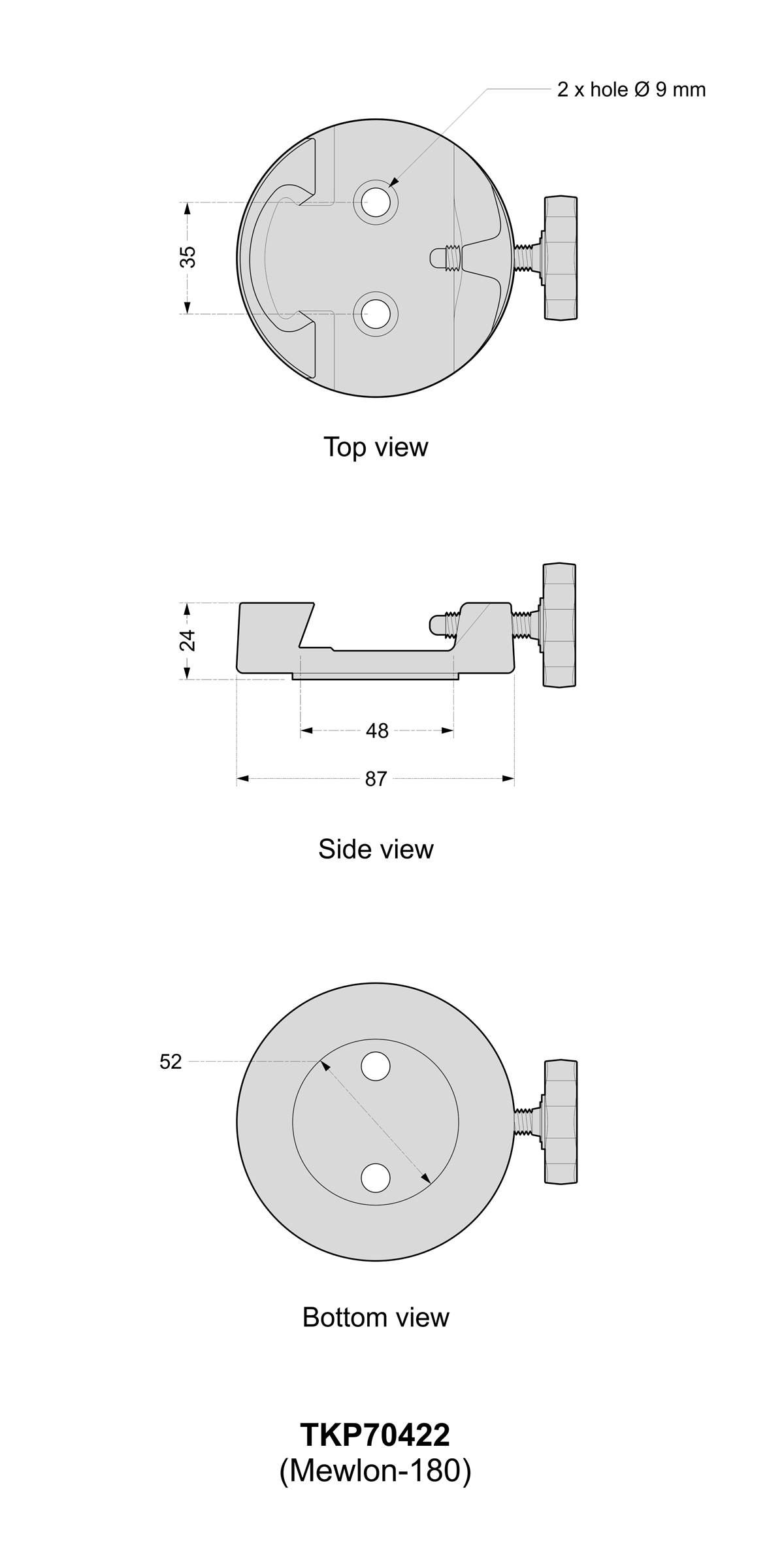 The female plate is in Vixen format. It is tightened with a central screw with a rounded end to avoid marking the male dovetails. It is fixed on Takahashi mounts by two M8 screws.