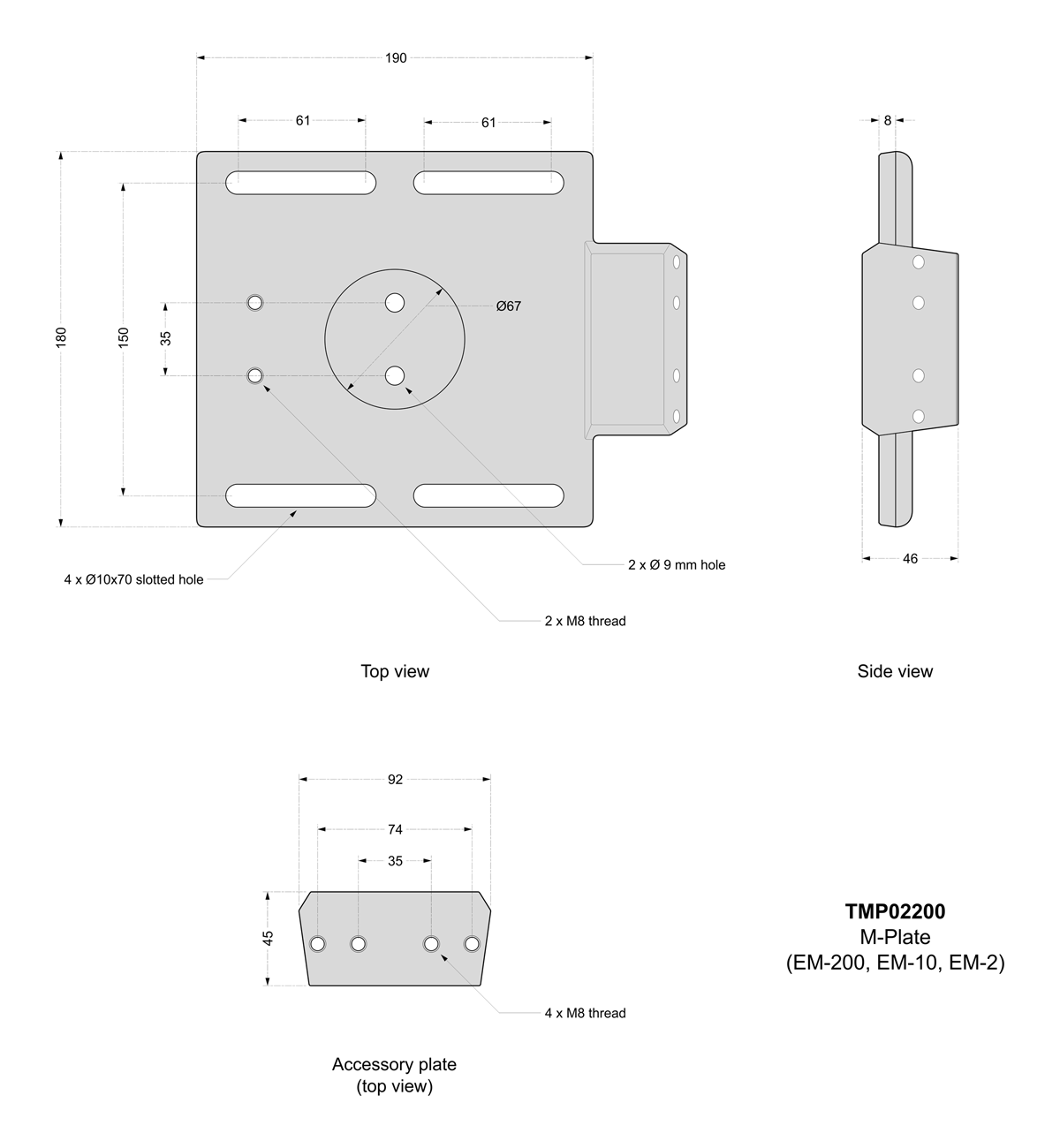 Fixing to the mount is by means of 2 M8 screws. The plate has 4 openings for fixing the double tube rings, with the possibility of a slight offset for balancing. A pair of offset M8 threaded holes allows the fixing of classic monobloc or symmetrical cradles with, again, a slight offset for balancing. The side plate is fixed. It is equipped with 4 M8 threaded holes for fixing the accessories in parallel with the optical tube or for fixing a small guiding scope like FS-60CB or GT-40.