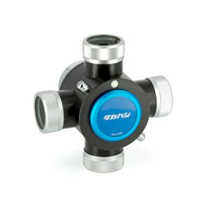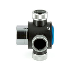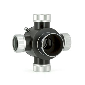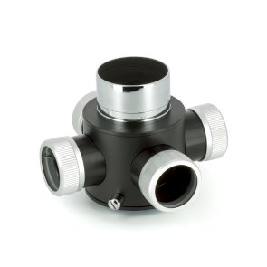 The Takahashi turret must be inserted in the 2" (50.8 mm) barrel of your telescope. A built-in prism, above which a ratcheting revolver rotates, reflects the image at 90°. The turret has 4 outlets accepting eyepieces with 1.25" (31.75 mm) barrel, with Teflon ring clamp. A fluorescent dot shows you which eyepiece is in position.